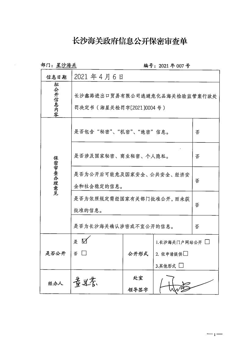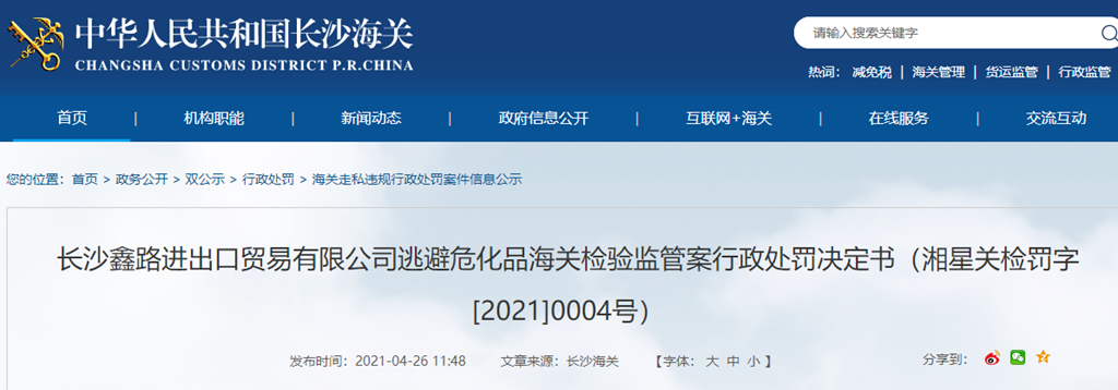 長(zhǎng)沙鑫路進(jìn)出口貿(mào)易有限公司逃避?;泛jP(guān)檢驗(yàn)監(jiān)管案行政處罰決定書(湘星關(guān)檢罰字[2021]0004號(hào))