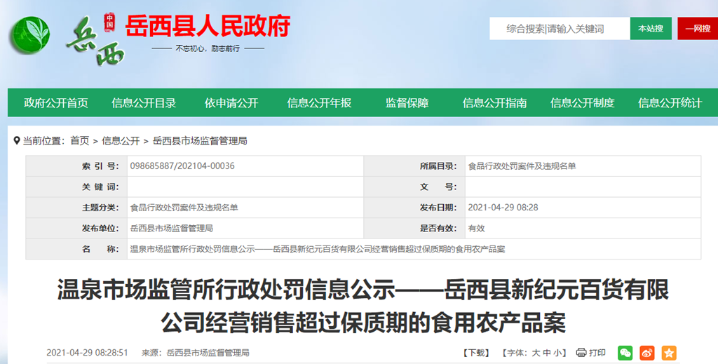 中國質(zhì)量新聞網(wǎng)訊 安徽省岳西縣人民政府網(wǎng)站4月29日刊登岳西縣溫泉市場監(jiān)管所行政處罰信息公示——岳西縣新紀元百貨有限公司經(jīng)營銷售超過保質(zhì)期的食用農(nóng)產(chǎn)品案。案件詳情見下表。