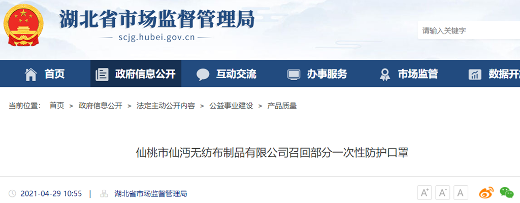 日前,仙桃市仙沔無紡布制品有限公司向湖北省市場(chǎng)監(jiān)督管理局備案了召回計(jì)劃,決定自2021年4月29日至7月27日召回2020年10月1日至31日生產(chǎn)的部分一次性防護(hù)口罩,品牌:仙沔無紡布,型號(hào):17.5cm*9.5cm,生產(chǎn)批號(hào):2020001,受影響的產(chǎn)品數(shù)量為6000包。
