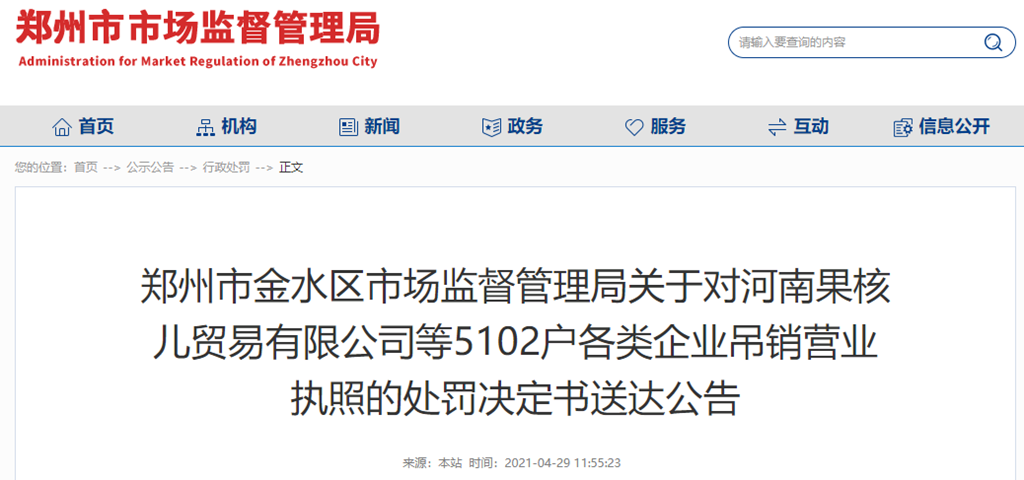 鄭州市金水區(qū)市場監(jiān)督管理局關于對河南果核兒貿(mào)易有限公司等5102戶各類企業(yè)吊銷營業(yè)執(zhí)照的處罰決定書送達公告