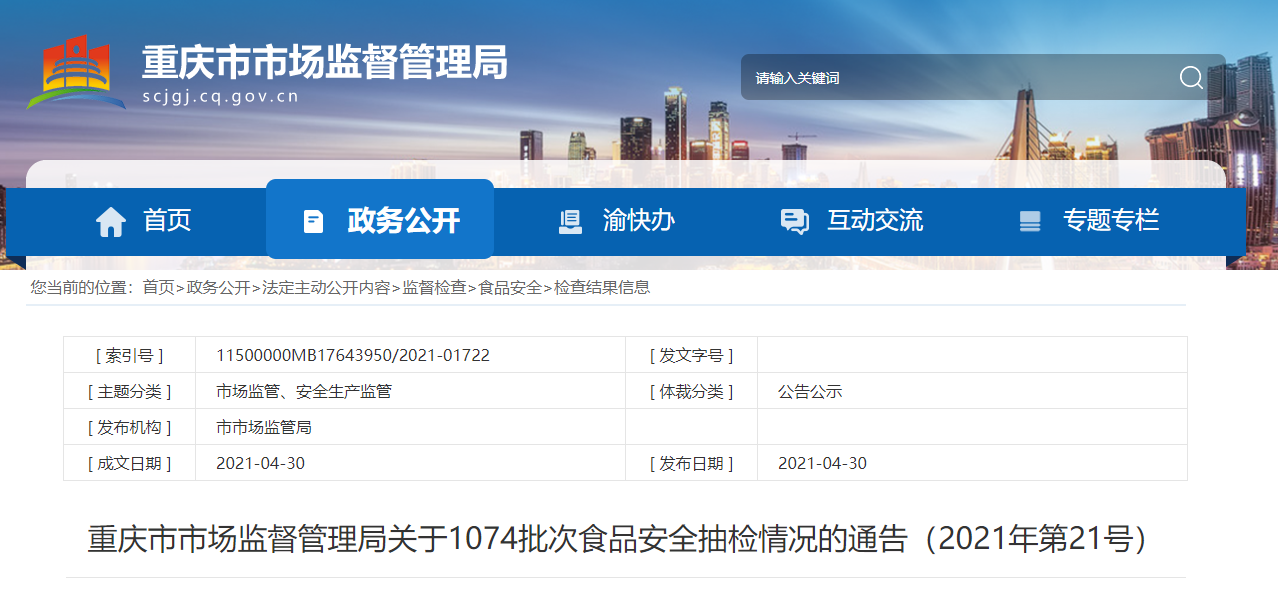 中國質(zhì)量新聞網(wǎng)訊 4月30日,重慶市市場(chǎng)監(jiān)督管理局網(wǎng)站發(fā)布關(guān)于1074批次食品安全抽檢情況的通告(2021年第21號(hào))。通告稱,近期,該局組織抽檢餐飲食品、茶葉及相關(guān)制品、炒貨食品及堅(jiān)果制品、蛋制品、淀粉及淀粉制品、調(diào)味品、豆制品、方便食品、糕點(diǎn)、罐頭、酒類、糧食加工品、飲料等24類食品1074批次樣品。抽樣檢驗(yàn)項(xiàng)目合格樣品1045批次,不合格樣品29批次。根據(jù)食品安全國家標(biāo)準(zhǔn),個(gè)別項(xiàng)目不合格,其產(chǎn)品即判定為不合格產(chǎn)品。