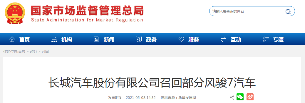 長(zhǎng)城汽車股份有限公司召回部分風(fēng)駿7汽車