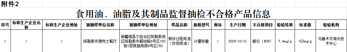 據(jù)悉,阿勒泰市德克士餐廳經(jīng)營過程中使用的煎炸過程用油(炸雞用油),酸價(jià)(KOH)不符合食品安全國家標(biāo)準(zhǔn)規(guī)定。檢驗(yàn)結(jié)果為7.4mg/g,標(biāo)準(zhǔn)值則為≤5mg/g,生產(chǎn)日期為2020年10月21日。檢驗(yàn)機(jī)構(gòu)為烏魯木齊海關(guān)技術(shù)中心。