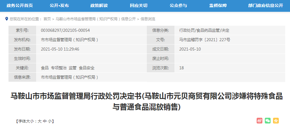 馬鞍山市市場監(jiān)督管理局行政處罰決定書(馬鞍山市元貝商貿(mào)有限公司涉嫌將特殊食品與普通食品混放銷售)