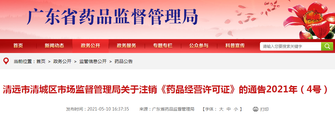 清遠(yuǎn)市清城區(qū)市場監(jiān)督管理局關(guān)于注銷《藥品經(jīng)營許可證》的通告2021年(4號)