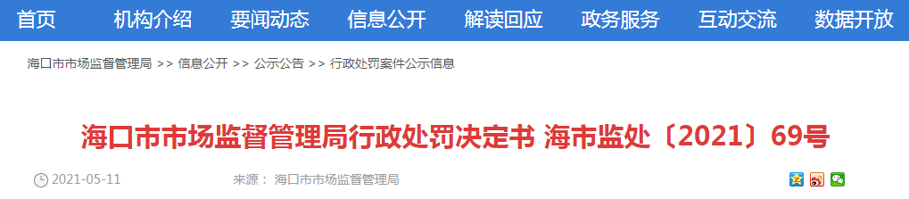 ??谑惺袌霰O(jiān)督管理局行政處罰決定書 海市監(jiān)處〔2021〕69號