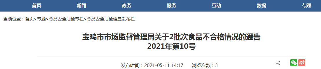 中國(guó)質(zhì)量新聞網(wǎng)訊 2021年5月11日,陜西省寶雞市市場(chǎng)監(jiān)督管理局網(wǎng)站發(fā)布2批次食品不合格情況的通告 2021年第10號(hào)。