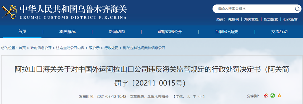 阿拉山口海關(guān)關(guān)于對(duì)中國(guó)外運(yùn)阿拉山口公司違反海關(guān)監(jiān)管規(guī)定的行政處罰決定書(阿關(guān)簡(jiǎn)罰字〔2021〕0015號(hào))