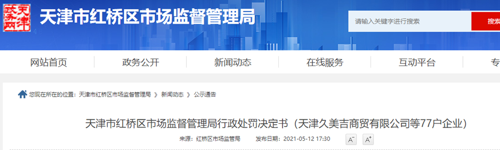 天津市紅橋區(qū)市場監(jiān)督管理局行政處罰決定書(天津久美吉商貿有限公司等77戶企業(yè)).pdf