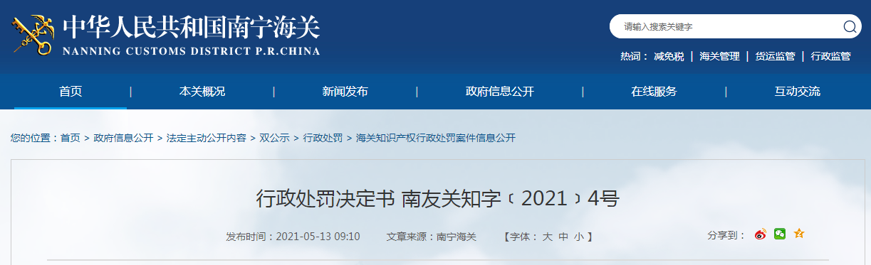 中國(guó)質(zhì)量新聞網(wǎng)訊 近日,友誼關(guān)海關(guān)發(fā)布行政處罰決定書(shū)(南友關(guān)知字﹝2021﹞4號(hào)),涉及廣西合安元貿(mào)易有限公司。