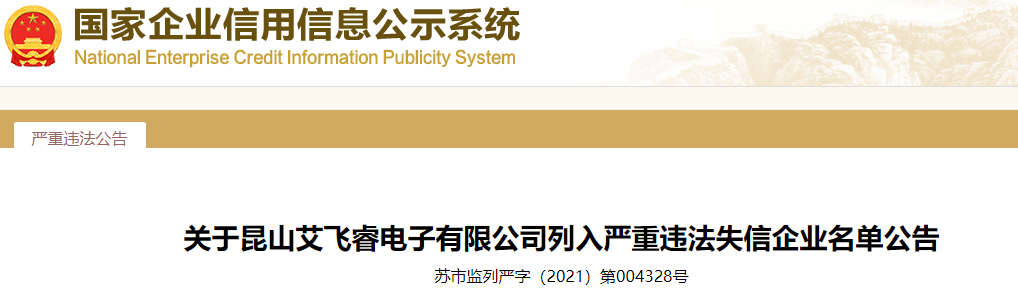 關于昆山艾飛睿電子有限公司列入嚴重違法失信企業(yè)名單公告