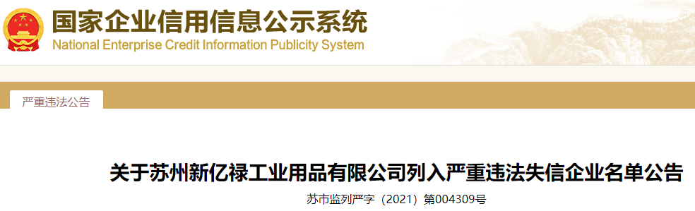 關(guān)于蘇州新億祿工業(yè)用品有限公司列入嚴重違法失信企業(yè)名單公告
