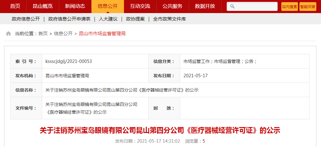 關(guān)于注銷(xiāo)蘇州寶島眼鏡有限公司昆山第四分公司《醫(yī)療器械經(jīng)營(yíng)許可證》的公示