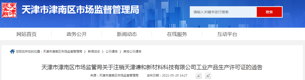 中國(guó)質(zhì)量新聞網(wǎng)訊 2021年5月20日,天津市津南區(qū)市場(chǎng)監(jiān)管局網(wǎng)站發(fā)布關(guān)于注銷天津謙和新材料科技有限公司工業(yè)產(chǎn)品生產(chǎn)許可證的通告。