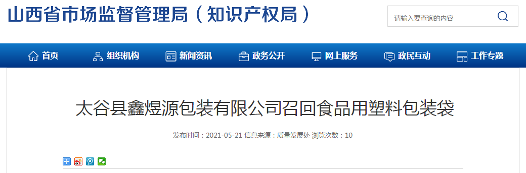 中國質(zhì)量新聞網(wǎng)訊 據(jù)山西省市場監(jiān)管局網(wǎng)站5月21日消息,日前,太谷縣鑫煜源包裝有限公司按照《消費(fèi)品召回管理暫行規(guī)定》的要求,主動向山西省市場監(jiān)督管理局報告了召回計劃,決定自即日起召回2019年11月03日生產(chǎn)的食品用塑料包裝袋,涉及數(shù)量為20400個。