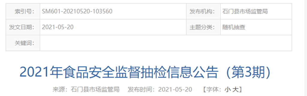 中國(guó)質(zhì)量新聞網(wǎng)訊 湖南省石門縣人民政府網(wǎng)站5月20日發(fā)布縣市場(chǎng)監(jiān)督管理局2021年食品安全監(jiān)督抽檢信息公告(第3期)。