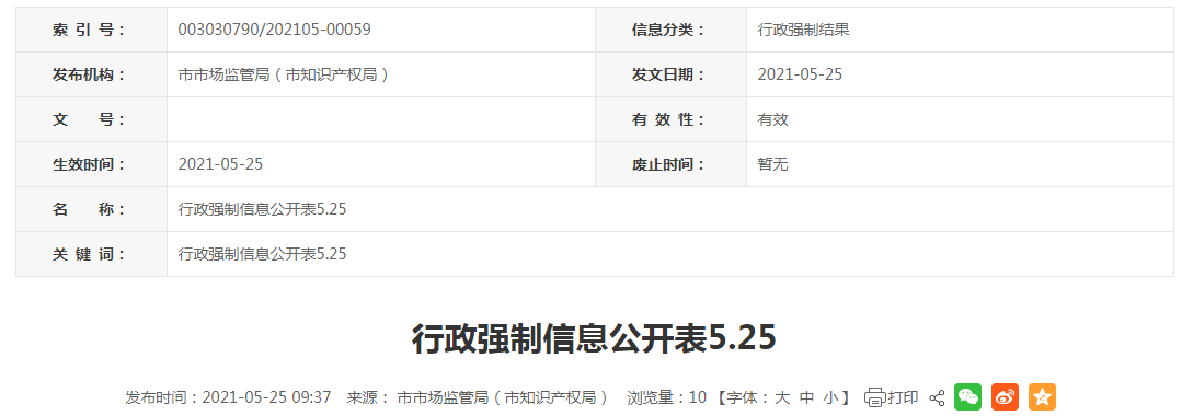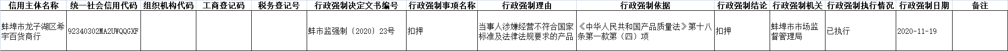 中國質(zhì)量新聞網(wǎng)訊 2021年5月25日,安徽省蚌埠市人民政府網(wǎng)站發(fā)布行政強(qiáng)制信息公開表5.25。涉及蚌埠市龍子湖區(qū)希宇百貨商行,具體信息如下: