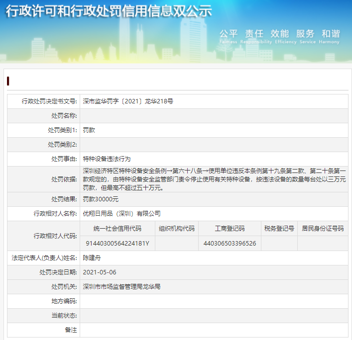 中國質(zhì)量新聞網(wǎng)訊 近日,深圳市市場監(jiān)督管理局龍華局對優(yōu)翔日用品(深圳)有限公司特種設(shè)備違法行為作出行政處罰決定:罰款30000元。行政處罰決定書文號為深市監(jiān)華罰字〔2021〕龍華218號。