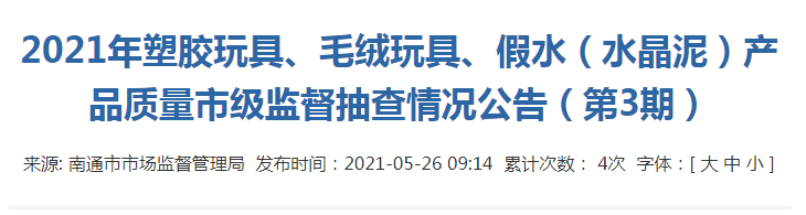 中國質(zhì)量新聞網(wǎng)訊 據(jù)江蘇省南通市市場監(jiān)管局網(wǎng)站5月26日消息,“六一”國際兒童節(jié)即將來臨,為切實保障兒童玩具質(zhì)量安全,該局對塑膠玩具、毛絨玩具、假水(水晶泥)產(chǎn)品質(zhì)量開展了市級監(jiān)督抽查。其中,檢出1批次商標為“多愛”的毛絨玩具不合格。具體信息如下: