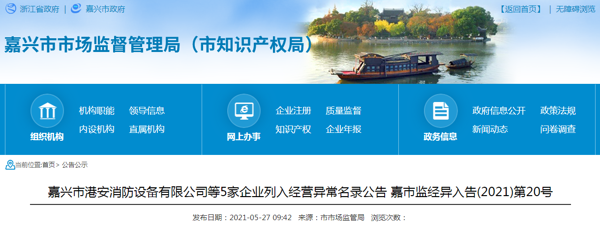 嘉興市港安消防設(shè)備有限公司等5家企業(yè)列入經(jīng)營異常名錄公告