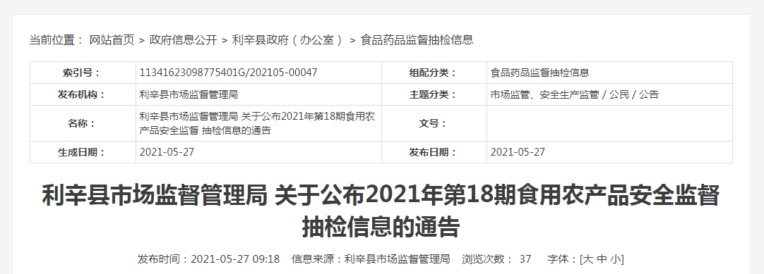 中國質(zhì)量新聞網(wǎng)訊 2021年5月27日,安徽省利辛縣市場監(jiān)督管理局網(wǎng)站公布2021年第18期食用農(nóng)產(chǎn)品安全監(jiān)督抽檢結(jié)果。
