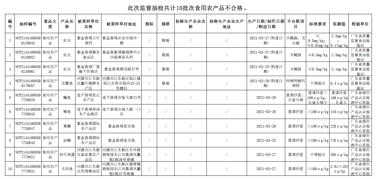 中國質(zhì)量新聞網(wǎng)訊 近日,廣東省河源市市場監(jiān)督管理局發(fā)布關(guān)于10批次食品不合格情況的通告(2021年第4期)。