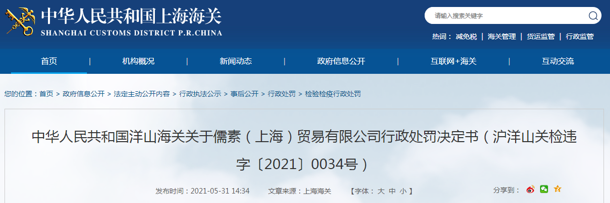 中國(guó)質(zhì)量新聞網(wǎng)訊 2021年5月31日,上海海關(guān)網(wǎng)站發(fā)布洋山海關(guān)關(guān)于儒素(上海)貿(mào)易有限公司行政處罰決定書(滬洋山關(guān)檢違字〔2021〕0034號(hào))。