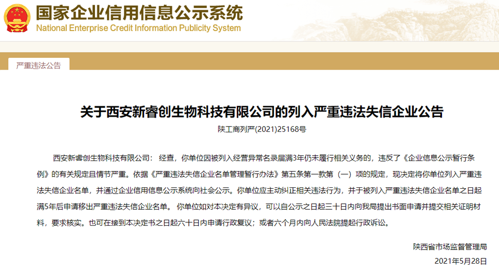 中國(guó)質(zhì)量新聞網(wǎng)訊 從國(guó)家企業(yè)信用信息公示系統(tǒng)獲悉,2021年5月28日,陜西省市場(chǎng)監(jiān)督管理局發(fā)布關(guān)于西安新睿創(chuàng)生物科技有限公司列入嚴(yán)重違法失信企業(yè)名單的公告(陜工商列嚴(yán)(2021)25168號(hào))。
