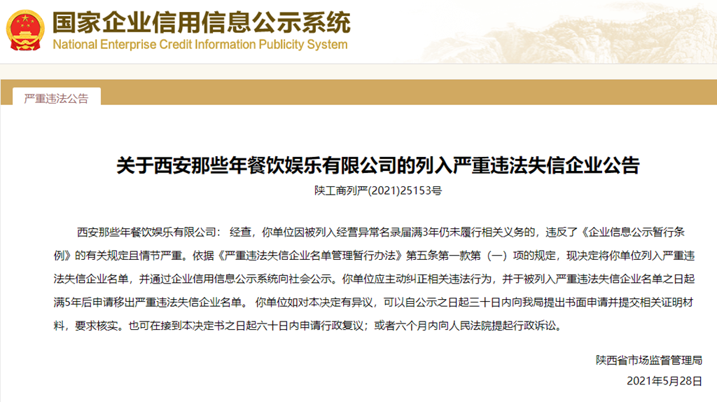 中國質(zhì)量新聞網(wǎng)訊 從國家企業(yè)信用信息公示系統(tǒng)獲悉,2021年5月28日,陜西省市場監(jiān)督管理局發(fā)布關(guān)于西安那些年餐飲娛樂有限公司列入嚴(yán)重違法失信企業(yè)名單的公告(陜工商列嚴(yán)(2021)25153號)。