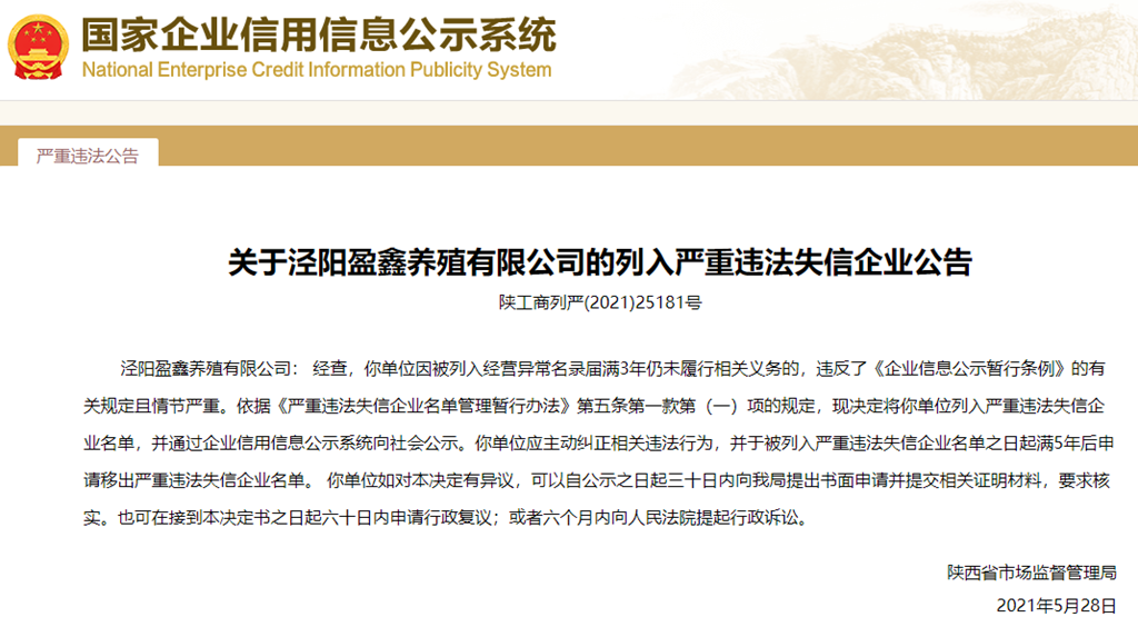 中國(guó)質(zhì)量新聞網(wǎng)訊 從國(guó)家企業(yè)信用信息公示系統(tǒng)獲悉,2021年5月28日,陜西省市場(chǎng)監(jiān)督管理局發(fā)布關(guān)于涇陽(yáng)盈鑫養(yǎng)殖有限公司列入嚴(yán)重違法失信企業(yè)名單的公告(陜工商列嚴(yán)(2021)25181號(hào))。