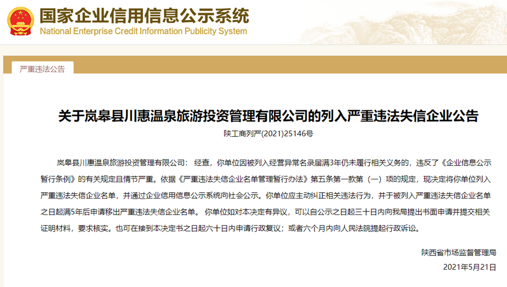 中國質(zhì)量新聞網(wǎng)訊 從國家企業(yè)信用信息公示系統(tǒng)獲悉,2021年5月21日,陜西省市場監(jiān)督管理局發(fā)布關(guān)于嵐皋縣川惠溫泉旅游投資管理有限公司列入嚴(yán)重違法失信企業(yè)公告(陜工商列嚴(yán)(2021)25146號)。