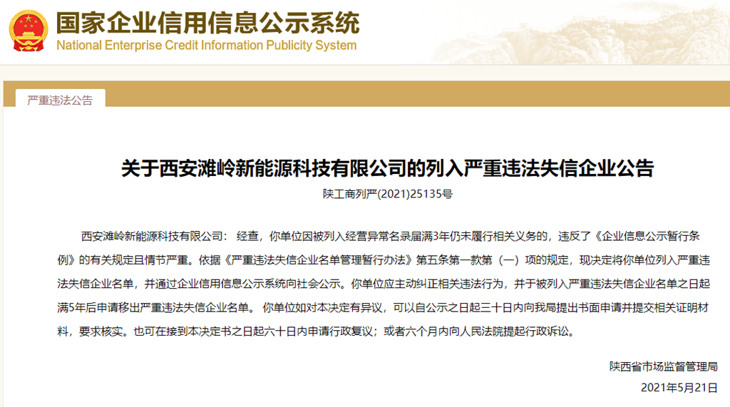 中國(guó)質(zhì)量新聞網(wǎng)訊 從國(guó)家企業(yè)信用信息公示系統(tǒng)獲悉,2021年5月21日,陜西省市場(chǎng)監(jiān)督管理局發(fā)布關(guān)于西安灘嶺新能源科技有限公司的列入嚴(yán)重違法失信企業(yè)公告(陜工商列嚴(yán)(2021)25135號(hào))。