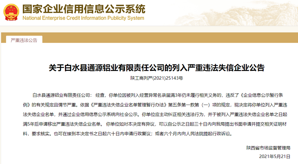 中國(guó)質(zhì)量新聞網(wǎng)訊 從國(guó)家企業(yè)信用信息公示系統(tǒng)獲悉,2021年5月21日,陜西省市場(chǎng)監(jiān)督管理局發(fā)布關(guān)于白水縣通源鋁業(yè)有限責(zé)任公司列入嚴(yán)重違法失信企業(yè)名單的公告(陜工商列嚴(yán)(2021)25143號(hào))。