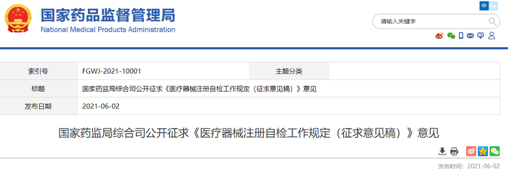 國家藥監(jiān)局綜合司公開征求《醫(yī)療器械注冊(cè)自檢工作規(guī)定(征求意見稿)》意見
