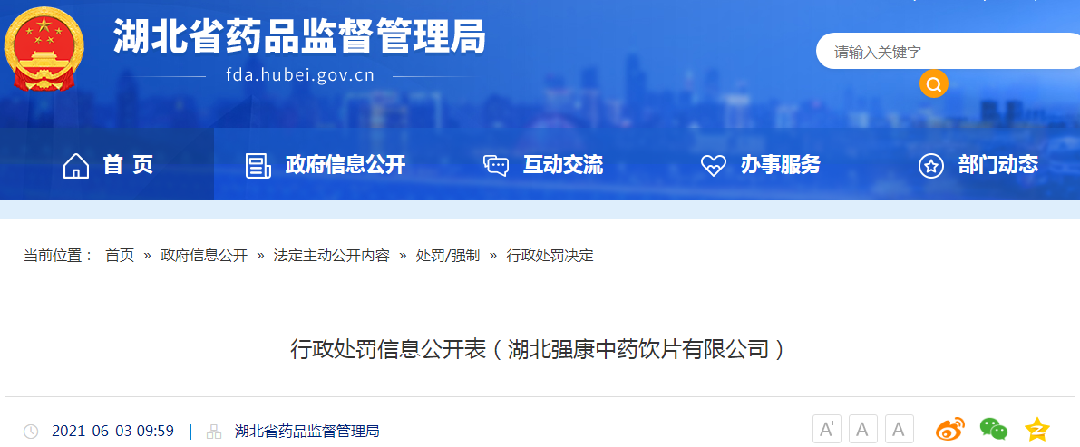中國(guó)質(zhì)量新聞網(wǎng)訊 2021年6月3日,湖北省藥品監(jiān)督管理局網(wǎng)站發(fā)布關(guān)于湖北強(qiáng)康中藥飲片有限公司的行政處罰信息。