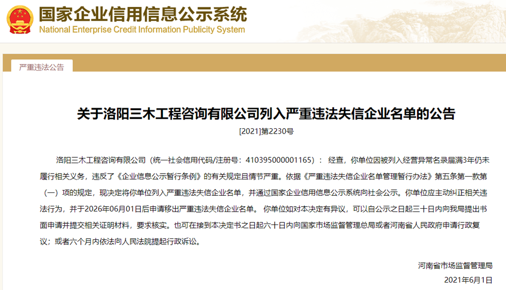 中國質(zhì)量新聞網(wǎng)訊 從國家企業(yè)信用信息公示系統(tǒng)獲悉,2021年6月1日,河南省市場監(jiān)督管理局發(fā)布關(guān)于洛陽三木工程咨詢有限公司列入嚴(yán)重違法失信企業(yè)名單的公告([2021]第2230號)。