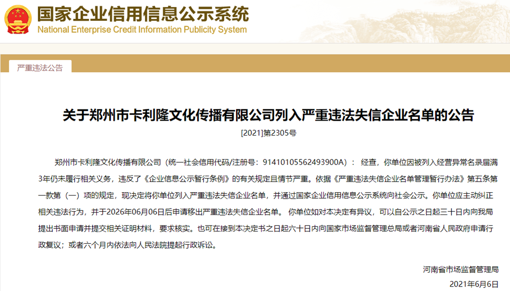 中國質(zhì)量新聞網(wǎng)訊 從國家企業(yè)信用信息公示系統(tǒng)獲悉,2021年6月6日,河南省市場監(jiān)督管理局發(fā)布關(guān)于鄭州市卡利隆文化傳播有限公司列入嚴重違法失信企業(yè)名單的公告([2021]第2305號)。