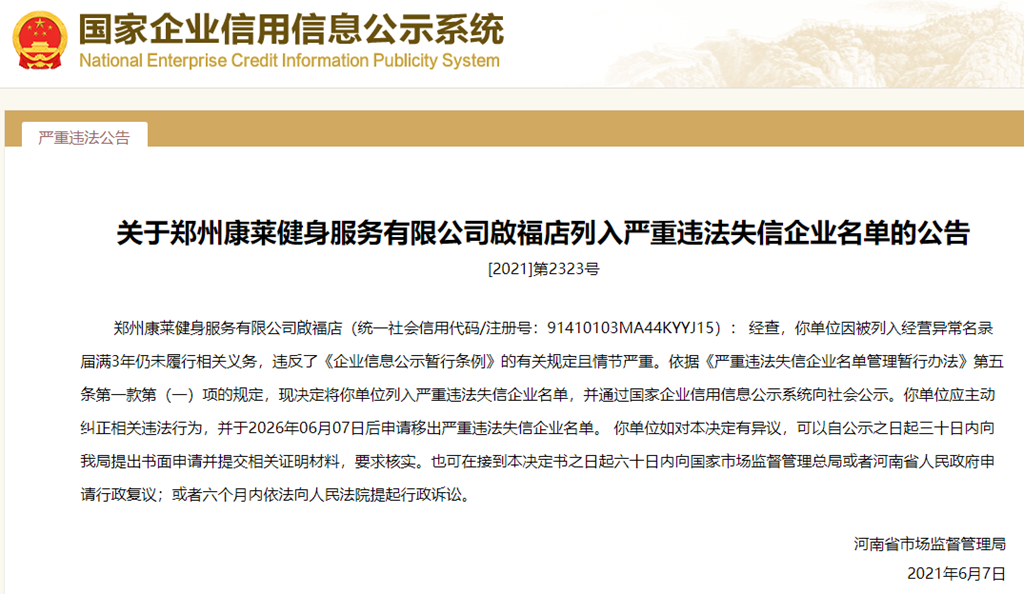 中國質(zhì)量新聞網(wǎng)訊 從國家企業(yè)信用信息公示系統(tǒng)獲悉,2021年6月7日,河南省市場監(jiān)督管理局發(fā)布關(guān)于鄭州康萊健身服務(wù)有限公司啟福店列入嚴重違法失信企業(yè)名單的公告([2021]第2323號)。