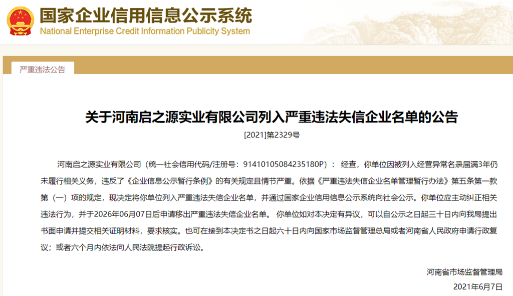 中國質量新聞網(wǎng)訊 從國家企業(yè)信用信息公示系統(tǒng)獲悉,2021年6月7日,河南省市場監(jiān)督管理局發(fā)布關于河南啟之源實業(yè)有限公司列入嚴重違法失信企業(yè)名單的公告([2021]第2329號)。