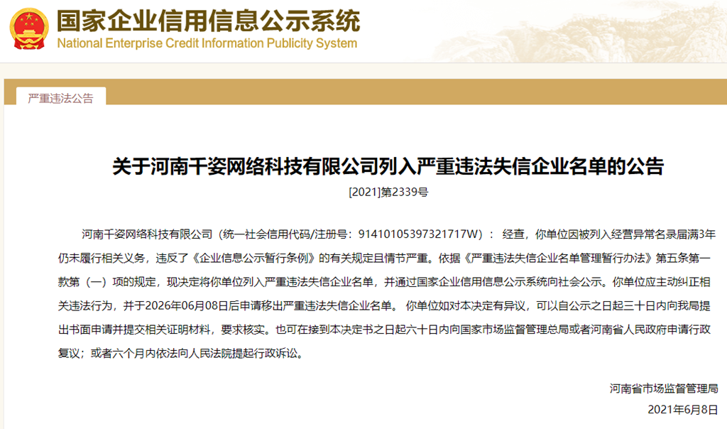 中國質(zhì)量新聞網(wǎng)訊 從國家企業(yè)信用信息公示系統(tǒng)獲悉,2021年6月8日,河南省市場監(jiān)督管理局發(fā)布關(guān)于河南千姿網(wǎng)絡(luò)科技有限公司列入嚴(yán)重違法失信企業(yè)名單的公告([2021]第2339號)。