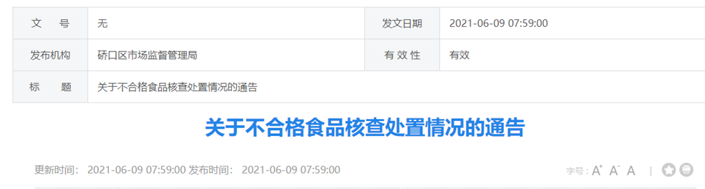 中國質(zhì)量新聞網(wǎng)訊 武漢市硚口區(qū)人民政府網(wǎng)站6月9日發(fā)布區(qū)市場監(jiān)督管理局關(guān)于不合格食品核查處置情況的通告。