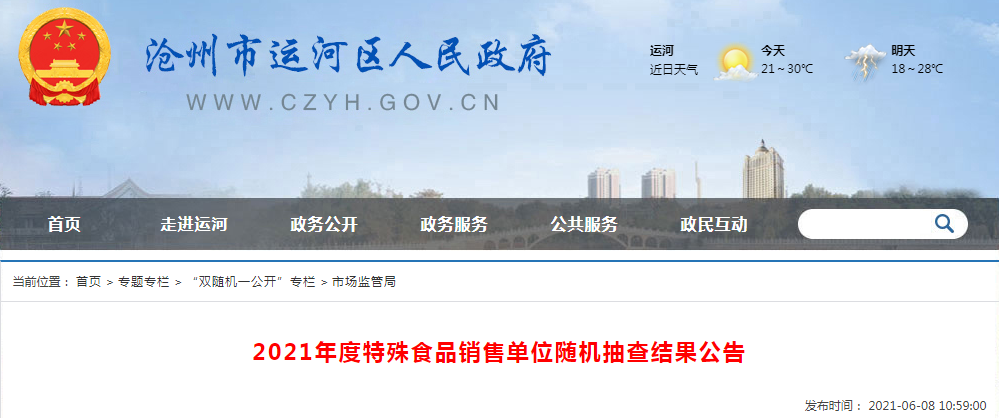 中國質(zhì)量新聞網(wǎng)訊 2021年6月8日,河北省滄州市運(yùn)河區(qū)人民政府網(wǎng)站發(fā)布2021年度特殊食品銷售單位隨機(jī)抽查結(jié)果公告。據(jù)公告,按照《2021年度特殊食品銷售單位隨機(jī)抽查工作方案》的要求,河北省市場監(jiān)管局通過“河北省雙隨機(jī)監(jiān)管平臺”隨機(jī)抽取3家市場主體,按照被檢查對象分派至運(yùn)河區(qū)市場監(jiān)督管理局,現(xiàn)已完成此次抽查任務(wù),抽查結(jié)果公示如下: