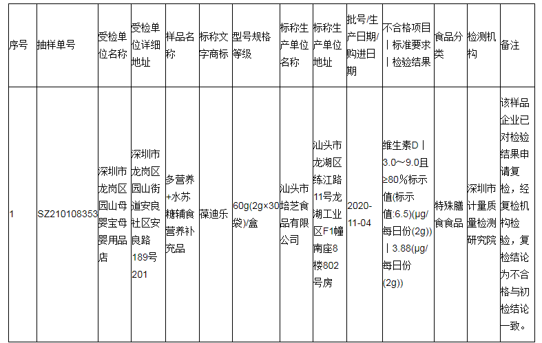 2020年5月15日,深圳市市場(chǎng)監(jiān)管局發(fā)布的2020年第十六期食品安全抽樣檢驗(yàn)情況通報(bào)中,2批次龍崗區(qū)橫星好媽媽兒童百貨店銷售的汕頭市培芝食品有限公司生產(chǎn)的嬰幼兒輔食營(yíng)養(yǎng)補(bǔ)充品不合格,涉及的不合格項(xiàng)目為維生素B??、維生素D。