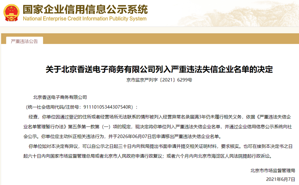 中國質(zhì)量新聞網(wǎng)訊 從國家企業(yè)信用信息公示系統(tǒng)獲悉,2021年6月7日,北京市市場監(jiān)督管理局發(fā)布關(guān)于北京香送電子商務(wù)有限公司列入嚴(yán)重違法失信企業(yè)名單的決定(京市監(jiān)京嚴(yán)列字〔2021〕6299號)。