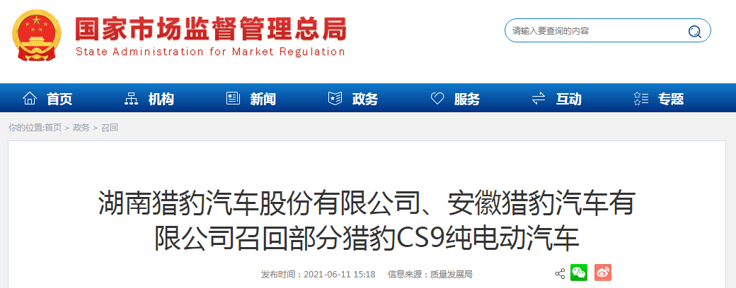 湖南獵豹汽車股份有限公司、安徽獵豹汽車有限公司召回部分獵豹CS9純電動(dòng)汽車