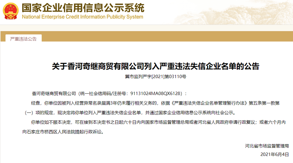 中國質(zhì)量新聞網(wǎng)訊 從國家企業(yè)信用信息公示系統(tǒng)獲悉,2021年6月4日,河北省市場監(jiān)督管理局發(fā)布關(guān)于香河奇繼商貿(mào)有限公司列入嚴重違法失信企業(yè)名單的公告(冀市監(jiān)列嚴字[2021]第03110號)。