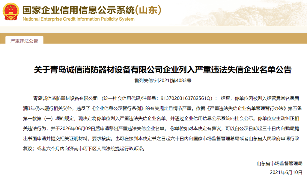 中國(guó)質(zhì)量新聞網(wǎng)訊 從國(guó)家企業(yè)信用信息公示系統(tǒng)(山東)獲悉,2021年6月10日,山東省市場(chǎng)監(jiān)督管理局發(fā)布關(guān)于青島誠(chéng)信消防器材設(shè)備有限公司列入嚴(yán)重違法失信企業(yè)名單的公告(魯列失信字[2021]第4083號(hào))。