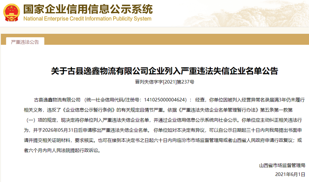中國(guó)質(zhì)量新聞網(wǎng)訊 從國(guó)家企業(yè)信用信息公示系統(tǒng)獲悉,2021年6月1日,山西省市場(chǎng)監(jiān)督管理局發(fā)布關(guān)于古縣逸鑫物流有限公司列入嚴(yán)重違法失信企業(yè)名單的公告(晉列失信字字[2021]第237號(hào))。