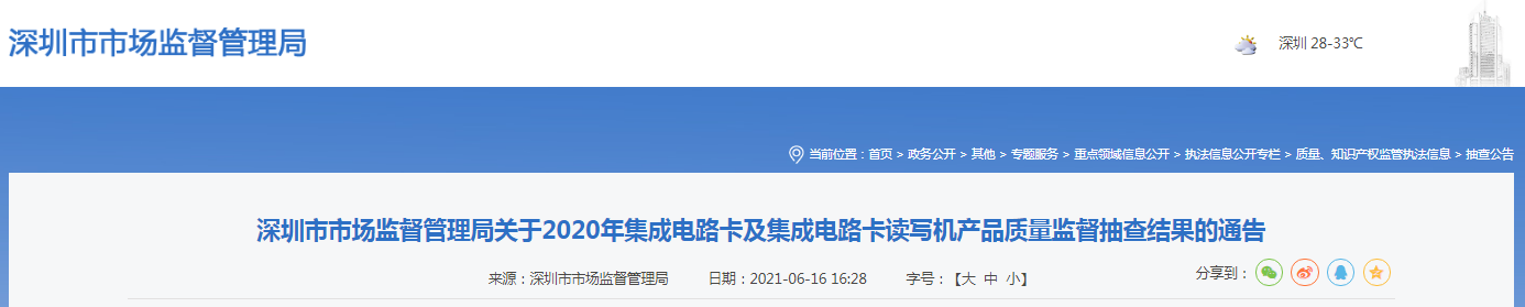 中國(guó)質(zhì)量新聞網(wǎng)訊 2021年6月16日,深圳市市場(chǎng)監(jiān)督管理局網(wǎng)站發(fā)布2020年集成電路卡及集成電路卡讀寫機(jī)產(chǎn)品質(zhì)量監(jiān)督抽查結(jié)果的通告。