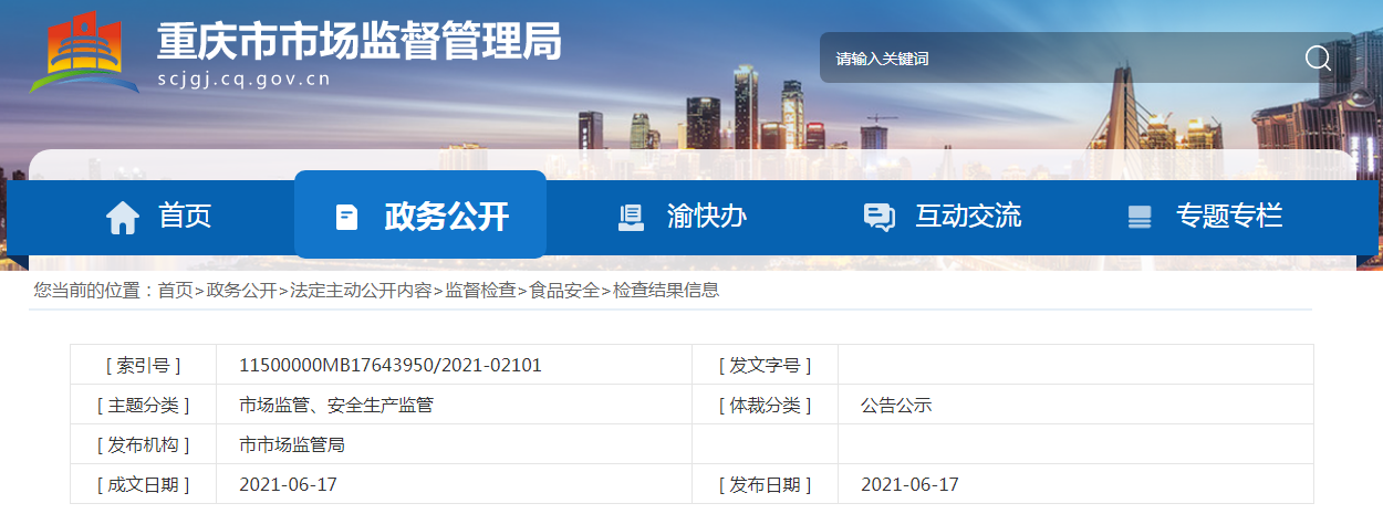 中國質(zhì)量新聞網(wǎng)訊 2021年6月17日,重慶市市場監(jiān)督管理局網(wǎng)站發(fā)布1104批次食品安全抽檢情況的通告(2021年第31號(hào))。